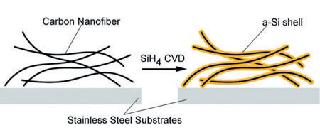 因此在最近的研究中,崔屹的研究小組用外層覆蓋了非晶硅的碳納米線取代了脆弱的硅納米線。碳芯固有的穩定性使得研究人員可以讓非晶硅帶滿鋰離子。結果,這種新的碳—硅混合陽極擁有了6倍于傳統全碳陽極的充電能力,早期的測試中,它們也比全硅陽極表現的更穩固。該結果發表在即將出版的《納米快報》上。利用這項成果,電池公司最終將能生產出更輕量的電池,這也是將來制造電動汽車的關鍵。崔屹指出,電池公司還可以在保持電池重量的條件下,增加50%的儲電量。