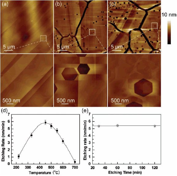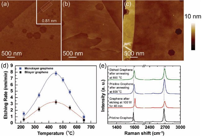 圖1新鮮解理的石墨(a)表面光滑臺階清晰可見,不同功率。(b)50W和(c)100W氫等離子體刻蝕過的石墨表面,顯示出了形狀規則的正六邊形孔。(d)刻蝕速率隨溫度的變化關系。(e)刻蝕速率隨時間的變化關系,證明刻蝕速率可精確穩定的控制在幾納米/分鐘。