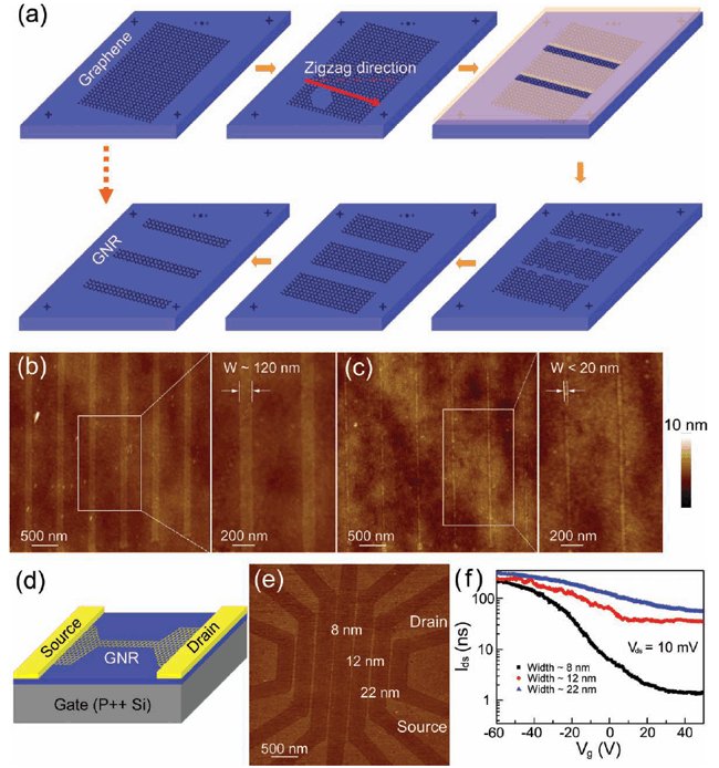 圖4 利用電子束曝光與各向異性刻蝕方法相結合制備具有特定取向的sub-20nm石墨烯納米帶的流程圖(a)。具體過程如圖(b)電子束曝光和氧等離子體刻蝕得到的起始寬度為120nm的石墨烯條帶,經過氫等離子體各向異性刻蝕之后細化到sub-20nm的石墨烯納米帶如圖(c)。(d)石墨烯納米帶場效應晶體管器件的結構示意圖,石墨烯為接觸電極,(e)不同寬度的石墨烯納米帶的器件,(f)對應的轉移特性曲線,證明8nm寬的石墨烯納米帶能在室溫下實現2個數量級的開關比。