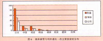 國(guó)外制備納米碳管的方法多種多樣,多使用高技術(shù)如高能束、等離子體或激光,而且在提純方面針對(duì)制各有序結(jié)構(gòu)納米碳管的難點(diǎn)問(wèn)題開(kāi)展了有序化方法等相關(guān)研究。在制備目的方面,國(guó)外申請(qǐng)偏向于光電子學(xué),如用于場(chǎng)發(fā)射器件或光學(xué)器件的納米碳管,表明國(guó)外申請(qǐng)專利技術(shù)含量高,而國(guó)內(nèi)在制備方法的落后和在電子信息和生物應(yīng)用薄弱都或多或少地說(shuō)明了我國(guó)和國(guó)外的差距。但目前國(guó)內(nèi)研究制造的世界上最長(zhǎng)最細(xì)的納米碳管表明我國(guó)正向高水平邁進(jìn)。