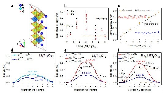 尖晶石結構Li3[LiTi5]O12(Li4Ti5O12)是重要的“零應變”鋰離子電池負極材料,嵌鋰電位為1.54 V,理論比容量175 mAh/g。一般認為,尖晶石結構晶格中的間隙位較小,不能容納半徑較大的Na+離子,因而具有層狀結構的含鈉過渡金屬氧化物獲得廣泛關注。2012年,中國科學院物理研究所/北京凝聚態物理國家實驗室(籌)的清潔能源實驗室固體離子學研究組博士生趙亮、胡勇勝研究員等首次報道了具有尖晶石結構的Li3[LiTi5]O12可用作鈉離子電池負極材料【Chin. Phys. B 21, 028201 (2012)】,平均嵌鈉電壓為0.9 V,比容量為150 mAh/g左右,對應3 mol Na的嵌入和脫出。最近,固體離子學研究組博士生孫洋、趙亮、潘慧霖等進一步研究發現,通過優化電解液、粘結劑和電極結構,可以顯著提高Li3[LiTi5]O12的循環性能和庫侖效率(圖1)。這些實驗結果表明,尖晶石結構的Li3[LiTi5]O12也可以可逆地容納Na+離子嵌入和脫出。借助于第一性原理計算(圖2)和原位XRD測試結果,可以推斷Na嵌入到Li3[LiTi5]O12的晶格會導致新型的三相反應: