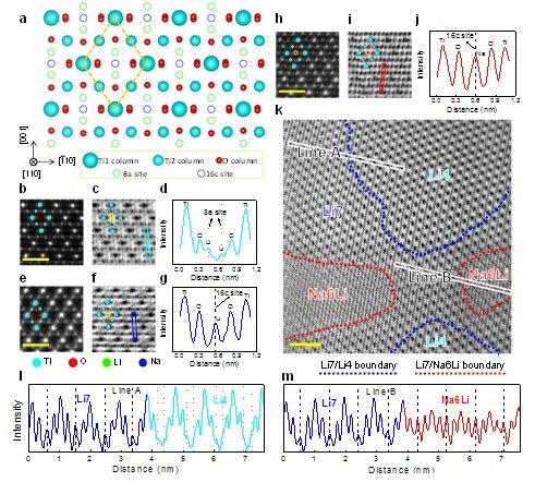 圖4. 1.5 mol Na 嵌入1 mol Li4Ti5O12納米顆粒的高分辨掃描透射電鏡成像。(a)尖晶石結構垂直于(110)面的格點排列;(b-d)Li4Ti5O12對應的電鏡成像;(e-g)Li7Ti5O12對應的電鏡成像;(h-j)Na6LiTi5O12對應的電鏡成像;(k)三相共存嵌鈉顆粒的環形明場像;(l,m)圖k相邊界對應的線掃描襯度。