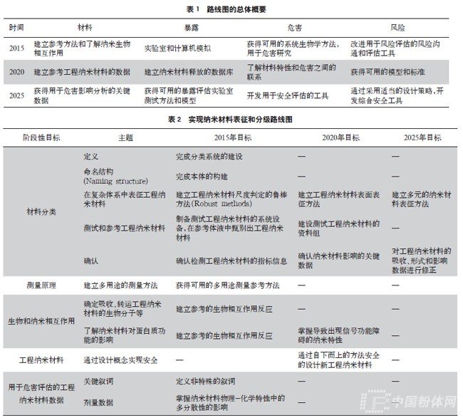 該部分主要包括材料分類、測量原理、生物和納米相互作用、工程納米材料、用于危害評估的工程納米材料數(shù)據(jù)等領域。材料分類領域的主要目標是完成工程納米材料的定義、構(gòu)建本體1、確定表征和測試納米材料的方法;測量方法領域的主要目標是建立多用途的測量方法等;生物和納米相互作用的主要目標是了解納米材料與生物的相互作用,建立相應的參考數(shù)據(jù);工程納米材料領域的主要目標是安全制造納米材料等;用于危害評估的工程納米材料數(shù)據(jù)的主要目標是獲取相應的的危害數(shù)據(jù)等,具體路線圖見表2。