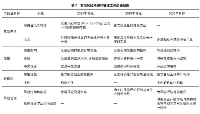 該部分主要包括風險評估、健康、建設數(shù)據(jù)庫和風險管理等領域,具體路線圖見表5。風險評估領域的主要目標是開展前瞻性的風險管理并開發(fā)相應的工具等;健康領域的主要目標是確定工程納米材料的健康影響、開展注冊登記等;建設數(shù)據(jù)庫領域的主要目標是建立數(shù)據(jù)庫基礎設施和本體等;風險管理領域的主要目標是風險認知和指導、通過方法設計實現(xiàn)預防等。