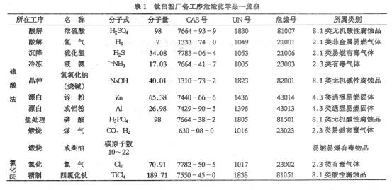 在鈦白粉生產過程中,不安全因素較多。本文只著重對鈦白粉企業的危險化學品所帶來的不安全因素進行分析。現把各工序所使用或所產生的危險化學品名稱及其CAS號(指美國化學文摘視為一種化學物質指定的唯一索引編號),UN號(指聯合國貨物運輸專家委員會在《關于危險貨物運輸的建議書》中對危險貨物指定的編號)、我國危險化學品編號和所屬危險化學品類別列于表1。