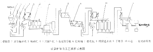 二十世紀八十年代末,干法制粉生產技術在意大利陶瓷墻地磚工業中到了推廣應用。我國四川某陶瓷墻地磚生產廠家也利用干法制粉生產技術成功地制造出500×10的大規格水晶釉面磚。目前國內外陶瓷墻地磚生產廠家廣泛應用的干法制粉生產技術的主要設備配置及工藝流程示意圖所示,其生產工藝是: