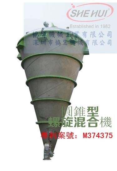 深圳市協宏機械有限公司CM圓錐型螺旋混合機在倒圓錐形的混合槽內部,安裝可以自轉與公轉的螺旋,是一種具備直立型優點的混合機,該機獲得專利(專利案號:M374375)。