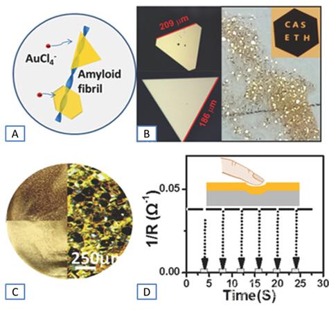 圖. A) 利用氯金酸和淀粉樣納米纖絲合成二維金單晶的示意圖;B)二維金單晶的光學(xué)顯微鏡照片;C)二維金單晶/聚氨酯復(fù)合膜的正面(左上)、背面(左下)及光學(xué)顯微照片(右);D)復(fù)合膜對(duì)應(yīng)力/應(yīng)變的傳感行為。