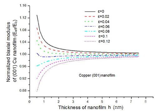 圖2:Cu納米薄膜雙軸拉伸等效模量隨薄膜厚度及外載應(yīng)變的變化 (據(jù):中國科學(xué)院)