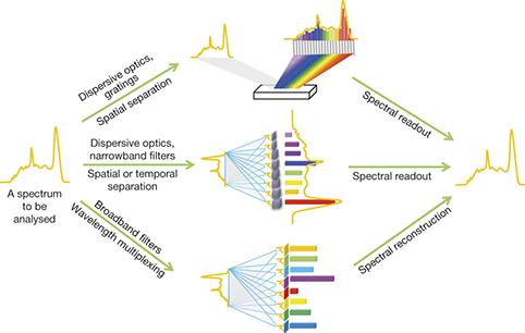 不同光譜儀工作原理比較圖。(最上面是目前最廣泛采用的光柵光譜儀的原理;最下面是量子點光譜儀的原理;中間為現有多數其他光譜儀技術原理。)