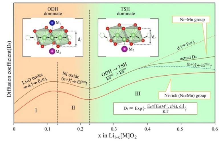 隨脫鋰過程的進行,鋰離子擴散動力學拐點整體示意圖。I, II和III區表示充電(脫鋰)過程中的不同階段。ODH和TSH表示兩種不同的擴散路徑,橙色和綠色表示兩種不同擴散路徑起作用的區域。