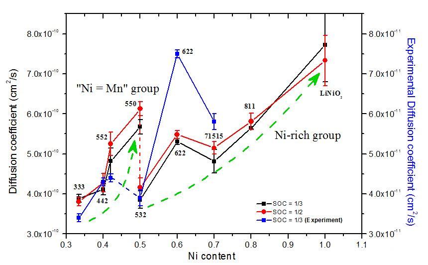 計算和實驗測量的三元材料擴散系數隨鎳含量從左到右增加時的變化規律。充電狀態(SOC)為1/2和1/3的擴散系數曲線分別以紅線和黑線表示。實驗數據以藍線表示,對應右側縱坐標,SOC為1/3。