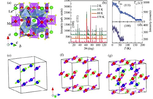 圖1:(a)A位有序立方鈣鈦礦LaMn3Cr4O12的晶體結構示意圖;(b)不同溫度下的中子粉末衍射譜;(c,d)磁衍射峰(111)與(100)衍射強度隨溫度的變化關系;(e)B位Cr-亞晶格自旋結構示意圖;(f)A'位Mn-亞晶格自旋結構示意圖;(g)體系總的自旋結構示意圖,自旋取向沿[111]方向。