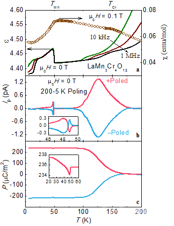 圖2:(a)A位有序立方鈣鈦礦LaMn3Cr4O12的磁化率(χ)與介電常數(ε)隨溫度的變化關系;(b)熱釋電電流(Ip)隨溫度的變化關系;(c)電極化強度(P)隨溫度的變化關系。