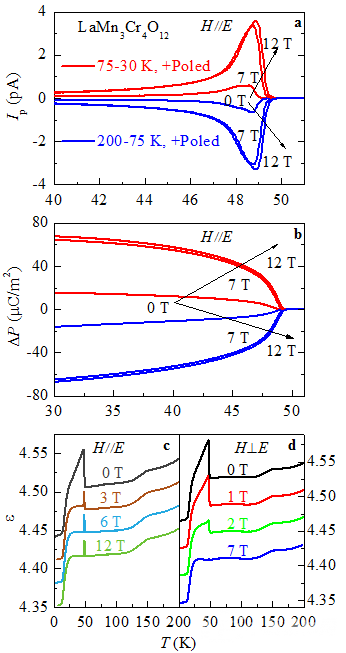 圖3:(a)A位有序立方鈣鈦礦LaMn3Cr4O12不同磁場下熱釋電電流隨溫度的變化關系;(b)不同磁場下凈電極化強度[ΔP = P(T) - P(50 K)]隨溫度的變化關系;(c、d)不同磁場下H∥E與H⊥E時介電常數隨溫度的變化關系。