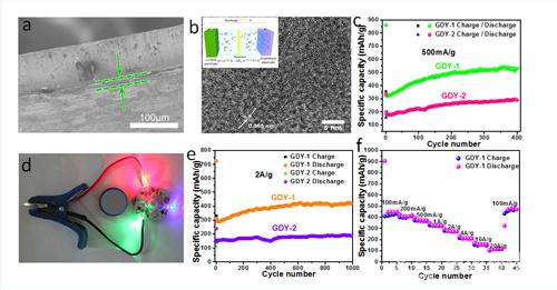 理論研究表明石墨炔是一種非常理想的儲鋰材料,理論容量達(dá)744 mAh g-1,多層石墨炔理論容量可達(dá)1117 mAh g−1(1589 mAh cm−3),且其獨(dú)特的結(jié)構(gòu)更有利于鋰離子在面內(nèi)和面外的擴(kuò)散和傳輸,這樣賦予其非常好的倍率性能。