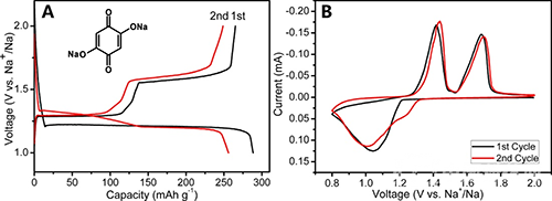 圖1 有機負極材料2,5苯醌-1,4二鈉(Na2C6H2O4)的化學結構式和電化學性能