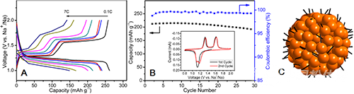 中國粉體網訊 有機材料具有豐富的化學組成,氧化還原電位可調,可以實現多電子轉移,而且原料來源豐富,成本低廉,材料可循環降解,對環境無害,作為鈉離子電池電極材料引起了大家的廣泛關注。最近,中國科學院物理研究所/北京凝聚態物理國家實驗室(籌)清潔能源實驗室E01課題組博士生吳曉燕、研究員胡勇勝等發現了一種新型鈉離子電池有機負極材料——2,5苯醌-1,4二鈉(Na2C6H2O4)(中國發明專利,申請號:2014102450296),并研究了電化學性能及其儲鈉機制。該材料的平均嵌鈉電位為1.4V,首周可逆容量265mAh/g。由于嵌鈉電位較高(>1.0V),充放電過程中表面形成SEI膜極少,獲得了較高的首周庫侖效率(92%)。但有機材料的電導率普遍偏低,他們利用該材料溶于水的特點,又發展了一種噴霧干燥方法,一步制備和構建了具有離子電子混合導電網絡結構的Na2C6H2O4/CNT復合材料,表現出良好的循環和倍率性能,在7C倍率下,可逆容量達到136mAh/g,1C倍率下30周循環后容量保持在195mAh/g。同時,這一方法可以推廣到具有低電導率的水溶性或油溶性材料,實現與親水性或親油性的碳納米管的有效復合,低成本、一步實現具有高電導率的復合電極材料(Journal of Materials Chemistry A, 2015, 3, 13193-13197)。