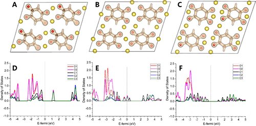 圖5 Na2C6H2O4(AD)、Na3C6H2O4(BE)和Na4C6H2O4(CF)的電荷密度圖和電子態密度圖