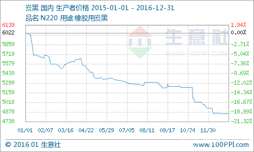 據生意社價格監測顯示,2015年初炭黑價格為6022,,2015年末炭黑價格為4878,下跌了18.99%。