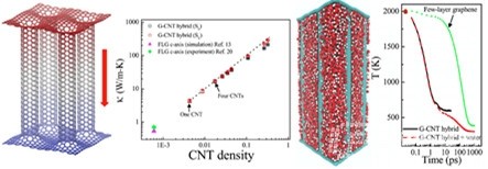 中國粉體網訊 同濟大學聲子學與熱能科學中心陳杰研究員與瑞士蘇黎世聯邦理工學院(ETH) Koumoutsakos教授研究小組合作,提出了一種顯著提高石墨烯層間導熱性能的新方法:用sp2共價鍵(強相互作用)來代替石墨烯層間范德華力(弱相互作用),構造無縫連接的石墨烯-碳納米管混合結構。通過計算機模擬,該團隊發現相比于范德華相互作用,共價鍵連接極大地提高了石墨烯中的晶格振動模式(聲子)在垂直方向的傳輸系數,使得該混合結構沿垂直方向的熱導率比相同厚度的多層石墨烯高出2個數量級,并且該混合結構的熱阻比最先進的(the state-of-the-art)導熱界面材料低3個數量級。因此,該混合結構既能通過石墨烯提供良好的接觸面,降低接觸熱阻,同時具有優異的垂直方向導熱性能,是理想的導熱界面材料。最后,該團隊還展示了通過流體將固體混合結構中的熱量移除,提供了一種基于石墨烯-碳納米管混合結構冷卻高溫表面的可行方案。