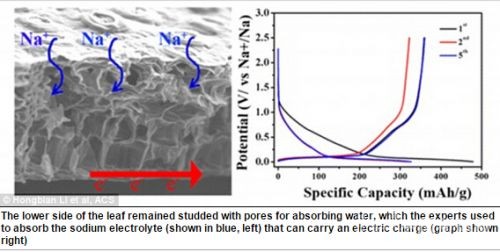 美國馬里蘭大學的研究人員成功地進行了這項實驗。他們首先把橡樹葉用1000攝氏度高溫烘烤一小時,使樹葉碳化。隨后加入鈉。橡樹葉背面原本用來吸收水分的細孔,現在用來吸收鈉電解質;樹葉的正面已經變成一層層納米結構的碳,可吸收攜帶電荷的鈉;整個過程正好形成鈉電池的正負兩極。