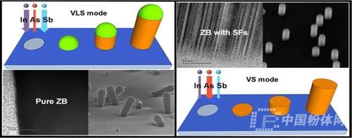 中國粉體網訊 III-V族半導體納米線憑借其獨特的準一維結構和物理特性在納米晶體管、納米傳感器和納米光電探測器等方面有著重要潛在應用,是當前國際研究的熱點。特別是,三元合金InAsSb納米線除了具有超高的載流子遷移率和極小的有效質量外,其可調的帶隙以及電、光學性能使其成為紅外探測器的理想材料。目前,國際上廣泛采用外來Au催化的氣-液-固(VLS)機制制備納米線,但Au催化劑能在半導體材料中形成深能級復合中心,這將大大降低器件的性能。因此,發展無Au催化納米線的制備技術尤為重要。此外,目前無外來催化含In的化合物納米線生長機制存在爭議,主要集中在In液滴自催化的VLS和應力驅動的氣-固(VS)兩種生長機制上。