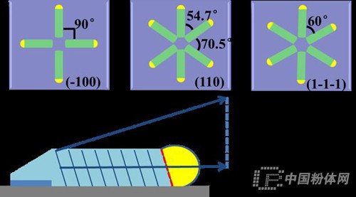 圖3. 平面InAsSb納米線在不同區取向的Si襯底上方向分布及生長模型示意圖