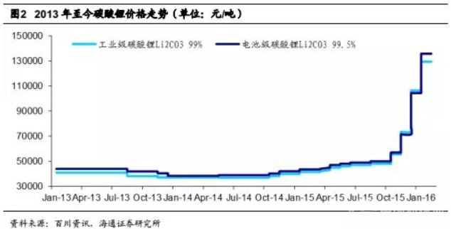經過了2013年至2014年前十個月的調整,碳酸鋰受新能源汽車需求拉動,開啟了本輪上漲。本輪上漲的起點為2014年10月,對應電池級碳酸鋰39000元/噸,工業級碳酸鋰37000元/噸。截至2016年2月18日,電池級碳酸鋰已達到15萬-16萬元/噸。