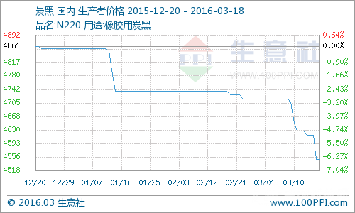 根據(jù)生意社數(shù)據(jù)監(jiān)測(cè)顯示,上周炭黑走勢(shì)下降,3月18日價(jià)格為4550元/噸,較3月14日價(jià)格4616元/噸下跌1.43%。