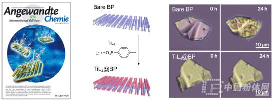 圖:(左) 德國應用化學封面圖片;(中) 鈦配體修飾的黑磷的制備;(右) 未經修飾的黑磷和鈦配體修飾的黑磷的穩定性比較。