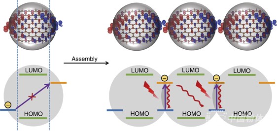 碳納米點具有發(fā)光性能優(yōu)異、水溶性好、生物相容性高、低成本、易修飾等諸多優(yōu)點,在生物醫(yī)療領域展現(xiàn)了獨有的優(yōu)勢和應用前景。然而,由于缺少有效的能帶調控手段,現(xiàn)有的碳納米點光學吸收主要集中在紫外到藍光波段,吸收帶拖尾延伸至近紅外區(qū),導致其在近紅外區(qū)的光吸收系數(shù)很低,這嚴重限制了其在長波長波段,特別是生物組織光學窗口的實際應用。針對這一難題,曲松楠課題組通過控制表面電荷分布不均的碳納米點的組裝,獲得了可見-近紅外區(qū)具有強吸收峰(λmax = 700 nm)和高光熱轉換效率(53%)的超碳納米點組裝體。在該超碳納米點組裝體內,相鄰的碳納米點組裝單元通過可能的靜電相互作用和氫鍵形成組裝體,從而實現(xiàn)組裝單元間表面能級的空間交疊和電荷轉移,在可見-近紅外區(qū)形成了獨立的強吸收峰。該類超碳納米點具有良好的生物相容性,有潛力作為近紅外光熱治療試劑應用于腫瘤光熱治療。