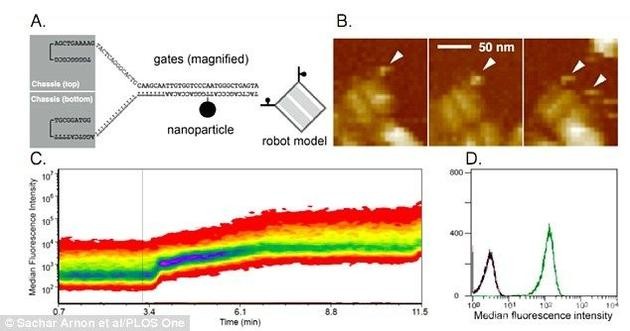 圖A和B中的納米機器人在蟑螂體內釋放熒光顆粒。圖C和D展示了釋放過程是根據人類大腦解決復雜數學問題時增多的思維活動來控制的方式