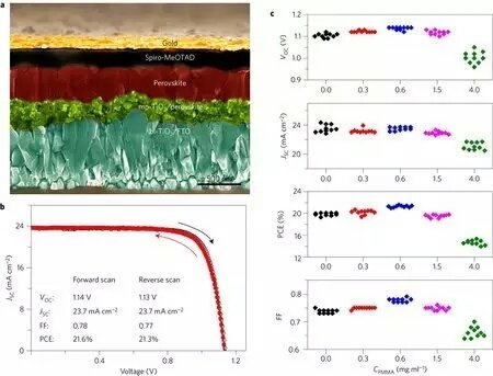 Bi等人成功制備得到一種高度光滑的鈣鈦礦薄膜,具有超長的光致發(fā)光壽命,表明其具有優(yōu)異的電學(xué)性能。在AM 1.5G光照條件下,PSC能量轉(zhuǎn)化效率高達(dá)21.6%,認(rèn)證效率為21.02%。