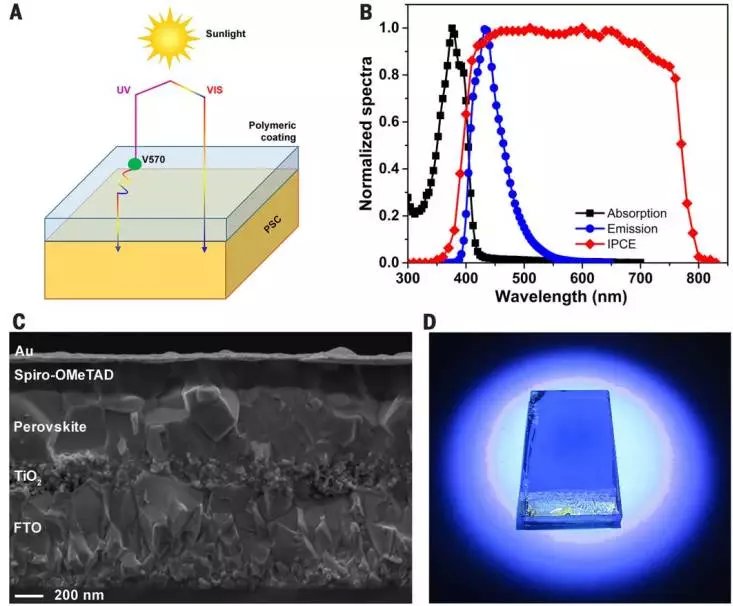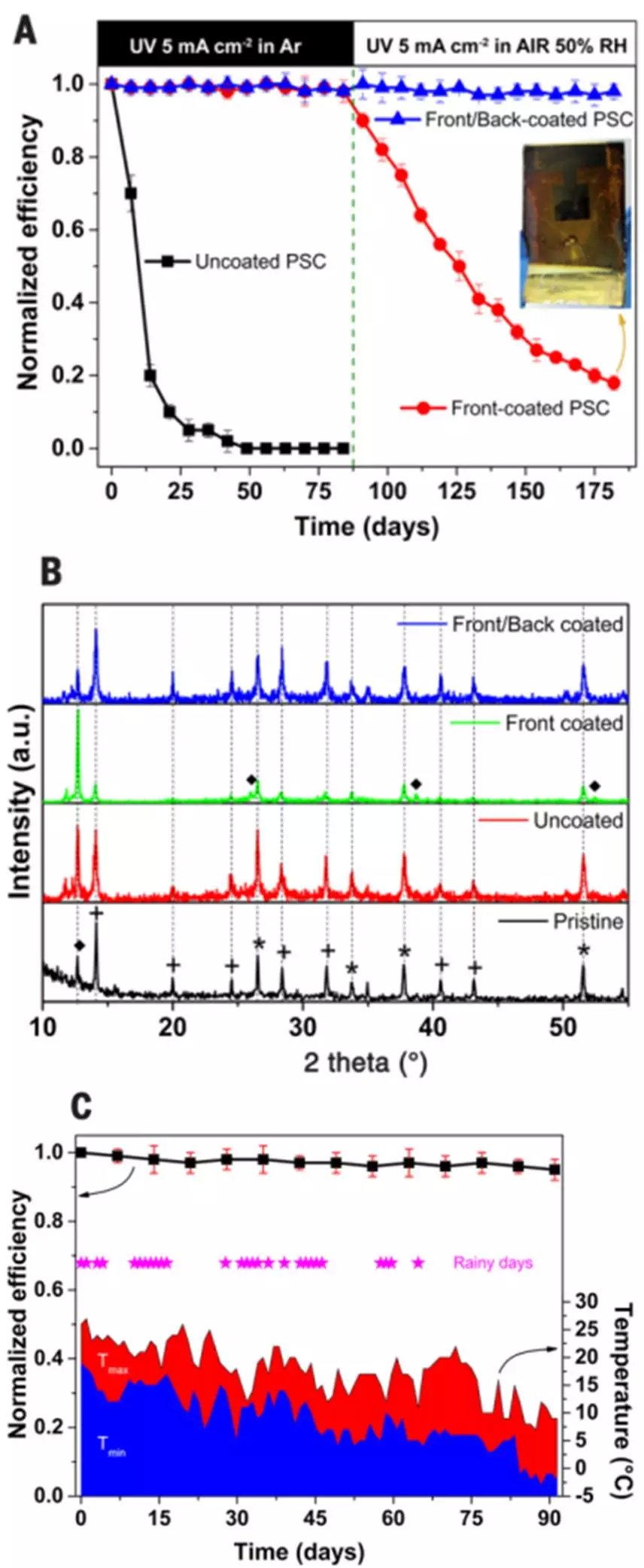 在可見光條件下,光敏聚合物會重新發(fā)射紫外線,使得PSC在標準光照下效率高達19%。更重要的是,在各種大氣環(huán)境和光化學應力條件下,長達6個月的系列老化測試表明,PSC的各個功能性都得到完好的保持!