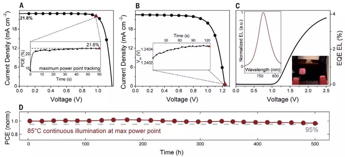 Michael Grätzel課題組Saliba等人將穩(wěn)定的氧化態(tài)銣離子(Rb+)引入鈣鈦礦,得到RbCsMAFA材料。在小面積上實現了21.6%的穩(wěn)定效率,平均效率20.02%(0.5 cm2, 19%),電致發(fā)光效率為3.8%。基于這種鈣鈦礦材料,研究人員制備了一種聚合物包裹型PSC器件,在85℃全太陽光下輻照500h,功能性可以得到95%的保持!