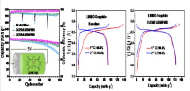 電解液添加劑是電池里不可或缺的一部分,通過其少量的添加,可以在電池的正負極表面形成更加穩定的SEI。實驗表明,通過在傳統電解液里添加0.05M LiBMFMB可以使LNMO的半電池在1C速率的條件下經過100圈充放電循環后容量衰減從未添加時的42.18%下降為13.5%。于此同時,循環伏安曲線顯示含有添加劑的電池在第一圈就可以形成穩定的SEI膜,然而無添加劑的電池需要更多圈循環以后才形成有效的SEI。XPS顯示LiBMFMB可以降低LiPF6的分解,從而形成更薄的SEI。此外,在石墨和LNMO組成的全電池中0.05 M LiBMFMB可以使首次庫倫效率達到90.4%, 然而無添加劑的全電池首次庫侖效率只有66.8%。