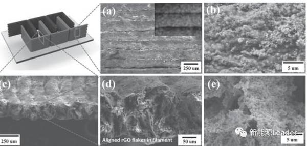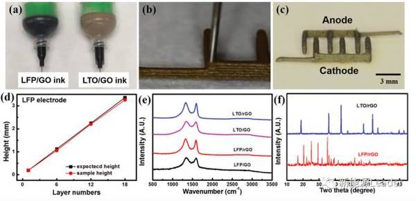 Kun Fu設(shè)計(jì)的電池,正負(fù)極分別采用了磷酸鐵鋰LFP和鈦酸鋰LTO,打印過程是通過噴嘴首先噴出細(xì)絲,根據(jù)設(shè)定好的程序一層一層的鋪在基板上,然后采用冷凍干燥,以除去其中的水分和固化結(jié)構(gòu),然后經(jīng)過熱處理,使氧化石墨烯GO轉(zhuǎn)變?yōu)檫原石墨烯,最后在正負(fù)極之間的間隙內(nèi)填入聚合物電解質(zhì),就完成了3D打印電池的制作。在電極中,由于剪切力的作用氧化石墨烯GO呈現(xiàn)出規(guī)則排列,增強(qiáng)了電子導(dǎo)電性,此外氧化石墨烯GO的多孔結(jié)構(gòu)也為LFO或者LTO和電解液提供了大量的附著點(diǎn)。