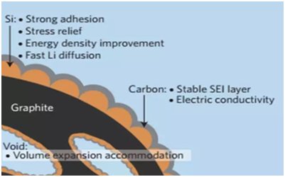 Si負極由于超高的比容量和豐富的儲量,成為最具代表性的新技術(shù)之一。Ko等人綜合石墨負極技術(shù)和Si納米技術(shù),開發(fā)了一種全新的、可大規(guī)模生產(chǎn)的C-納米Si-石墨復(fù)合負極材料。鋰化過程中,Si納米殼層隨著體積變化而膨脹,并且可以保持形狀完好,不會破裂或者殘留于Si和石墨之間。研究表明,其性能優(yōu)于現(xiàn)有標準的商業(yè)化石墨負極。