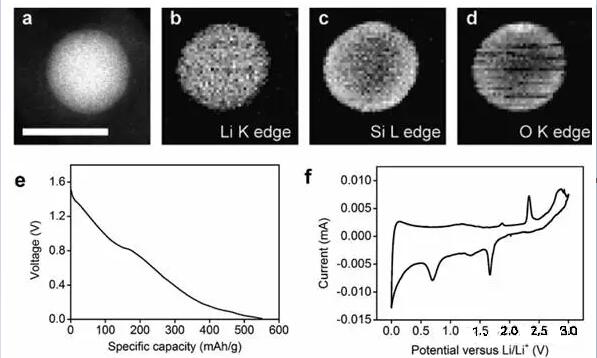 圖2.(a)嵌鋰二氧化硅的STEM圖和(b)Li,(c)Si,(d)O 分布的EELS圖.(e)二氧化硅納米顆粒的放電曲線.(f)二氧化硅納米顆粒的CV曲線.