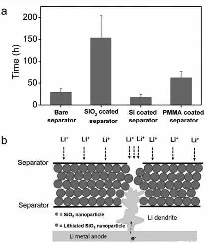 圖3.(a)不同隔膜抑制枝晶穿透對比圖.(b)納米二氧化硅三明治隔膜提高電池安全性示意圖
