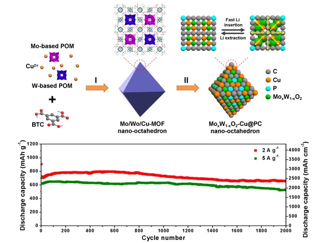 磷摻雜碳包覆MoxW1-xO2/Cu納米復(fù)合電極材料表現(xiàn)出優(yōu)異的電化學(xué)性能,在2-5 A g-1高倍率條件下穩(wěn)定循環(huán)2000次后容量損失率僅為0.043%每次,體積比容量可達1930-2390 mAh cm-3,是石墨類負極材料的2-3倍,可與Si、Sn基負極材料媲美。
