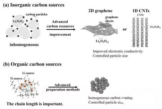 圖1 無機碳源和有機碳源制備碳包覆鈦酸鋰復合材料對比示意圖