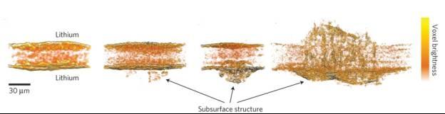金屬鋰形成枝晶,造成電池短路的3維示意圖