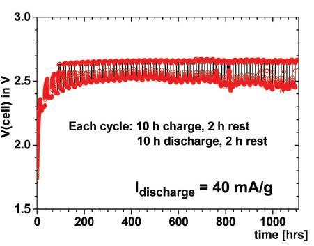 研究人員還發現,這種電池能在保持很低的電池內阻情況下,能實現多達1200余次的充放電。下圖給出了電池長達1000多小時的充放電測試曲線。從這個電壓-時間曲線中,可以看出這款新型鋰-硫電池在很長的循環壽命中,仍然能夠保持非常穩定的放電電壓。