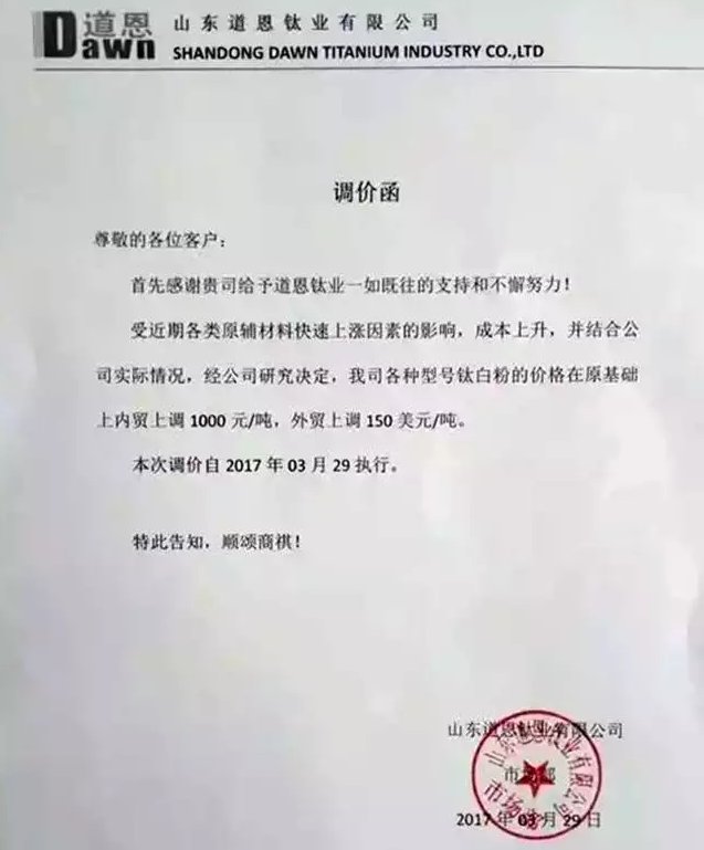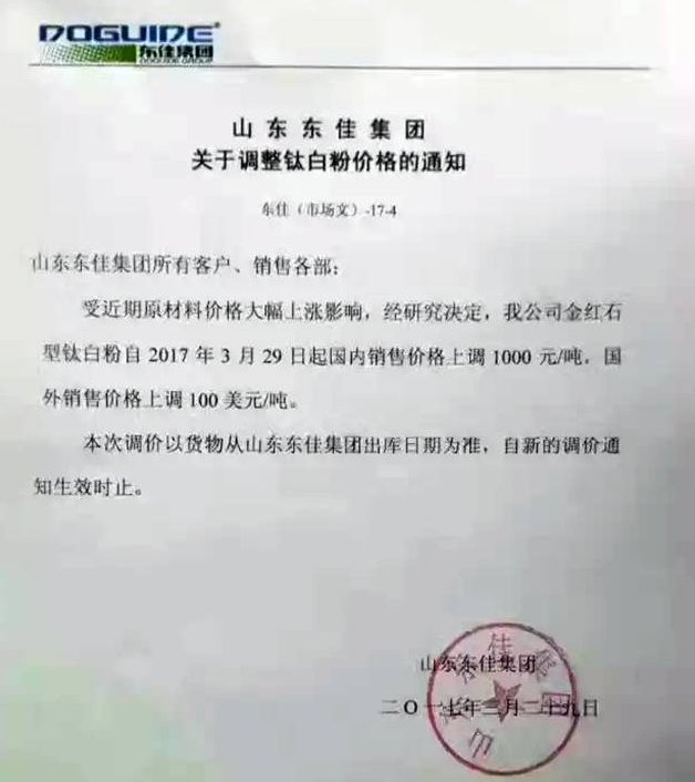東佳集團鈦白國內上調1000元/噸,外貿上調100美元/噸