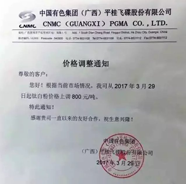 中核鈦白國內上調1000元/噸,外貿上調100美元/噸