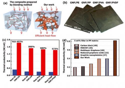 目前,中科院寧波材料所的研究人員開發了一種低成本、工藝簡單、且能大規模應用的石墨烯/高分子高導熱復合材料的制備方法,將高分子粉體表面均勻包裹上石墨烯納米片,再通過熱壓制備成復合材料。通過此工藝,石墨烯能在高分子基底中形成胞室狀的三維結構,其復合材料熱導率能達到一般熔融混合法產品的兩倍。這種方法適用于各類熱塑性聚合物,包含對聚乙烯、聚乙烯醇、聚偏氟乙烯等,在重量百分率10%的石墨烯添加量下,能將高分子聚合物的本征熱導率提高5~6倍。這一工作有助于推動石墨烯相關高分子導熱復合材料的制備及應用的發展。