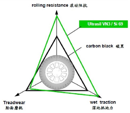 白炭黑凝聚體間的摩擦小,能量損失減少,滾動阻力降低;白炭黑施加的拘束小、橡膠能自由運動,橡膠彈性大、易吸收路面的變形,在與路面之間、易生成溶解橡膠,體現出高抓地力。對于炭黑來講,凝聚體大、摩擦大,橡膠對炭黑有較大的拘束。