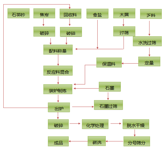 SiO2+3C→SiC+2CO -46.8KJ(11.20kcal)。然后煉得的碳化硅塊,經(jīng)破碎、酸堿洗、磁選和篩分或水選而制成各種粒度的碳化硅粉。具體流程圖如下: